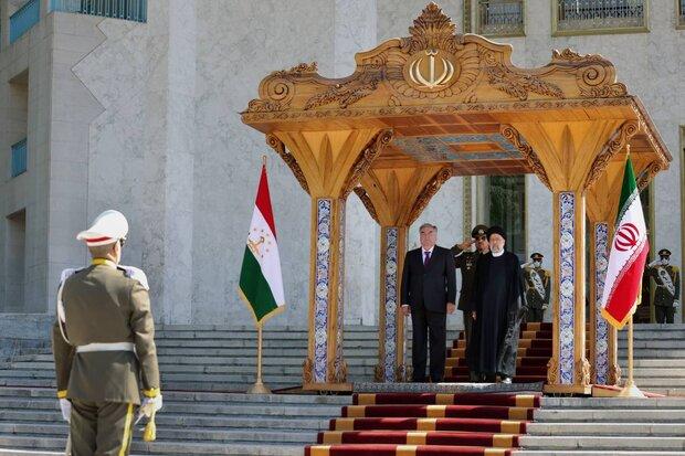 Tajik President Emomali Rahmon who arrived in the Iranian capital of Tehran on Sunday afternoon, was officially welcomed by the Iranian President on Monday morning in the Saadabad Complex.