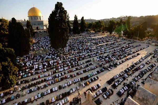 Despite the strict measures imposed by the occupation on Al-Aqsa Mosque and the occupied Quds, 100,000 worshipers flocked to the mosque in the morning to perform the Eid prayers.