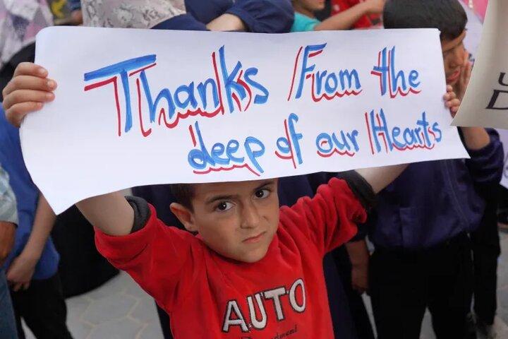 "Thank you to the brave students in American universities" and "Thank you for standing with Gaza," read some banners waved by the children in the city of Deir al-Balah, Anadolu reported.