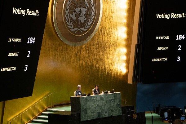 The motion was approved for the 29th year in a row with 184 votes in favor, three abstentions and two no votes cast by the US and Israel.