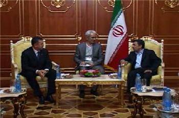 IRI President Mahmoud Ahmadinejad said a railway construction project between Tehran and Ashgabat will develop the entire region. President Ahmadinejad made the remarks in a meeting with Turkmen Vice-President Khajeh Mohammadov Sunday evening. The meeting was held in Turkmenistan on the sidelines of the third International Nowruz Celebrations. The Iranian President said there is no obstacle in the way of expansion of bilateral cooperation between the two friendly countries of Iran and Turkmenistan. For his part, the Turkmen vice-president said his country sees the Islamic Iran as a friendly nation, underlining the need for promotion of all-out ties between the two sides.