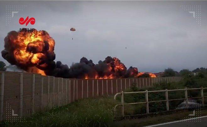 As the plane crashes to the ground, thick black smoke billows as the pilot can be seen parachuting after ejecting from the aircraft.