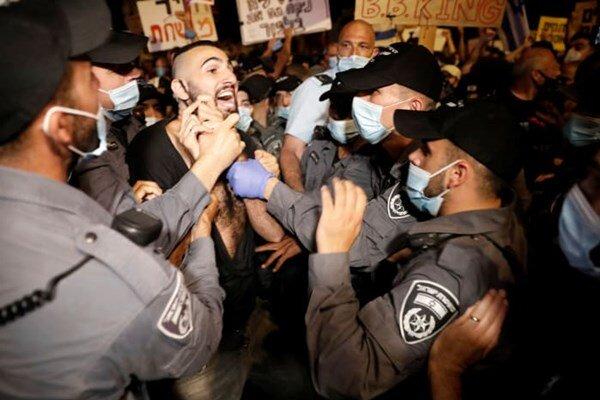 Zionist police clashed with protesters in front of the residence of Prime Minister Benjamin Netanyahu in the occupied Al-Quds and reportedly arrested 50 people on Tuesday.