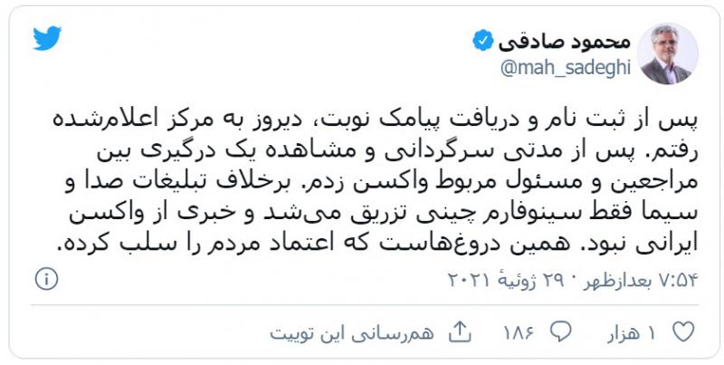 محمود صادقی: برخلاف تبلیغات صداوسیما، خبری از واکسن ایرانی نیست