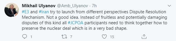 «اولیانوف»، با انتشار توییتی ضمن انتقاد از راهکار استفاده از مکانیسم حل و فصل اختلاف در چارچوب توافق هسته ای، نوشت «تروئیکای اروپایی و ایران تلاش دارند تا مکانیسم حل و فصل اختلاف را فعال کنند؛ طرفین برجام باید به جای چنین مکانیسمهای بی ثمری که پتانسیل آسیب زایی دارند، با هم در مورد چگونگی حفظ توافق هستهای که در وضع بسیار بدی قرار دارد، همفکری کنند.»