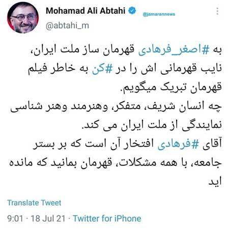 ابطحی به اصغر فرهادی پس از موفقیت فیلم جدیدش «قهرمان» در جشنواره کن تبریک گفت. توئیت محمدعلی ابطحی به شرح زیر است؛