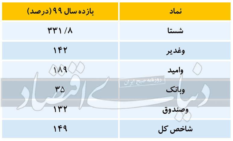 شستا: نمادهای عمده پرتفوی بورسی شستا شامل ۸۷/ ۷۱ درصد سرمایهگذاری نفت و گاز و پتروشیمی تامین، ۱۴/ ۸۸ درصد سرمایهگذاری صباتامین، ۶۵/ ۳۵ درصد شرکت سرمایهگذاری دارویی تامین، ۶۲/ ۲۴درصد کشتیرانی جمهوری اسلامی ایران، ۳۸/ ۲۶ درصد شرکت سرمایهگذاری صدر تامین، ۶۳/ ۸۳ سرمایهگذاری سمان تامین که مجموع داراییهایش ۱۶۸هزار و ۴۳۱ میلیارد تومان است (در اینجا به دلیل کم بودن میزان مالکیت در شرکتهای دیگر نسبت به این نمادها و تعدد آنها از آوردن نامشان خودداری شده است) که دارای بهای تمام شدهای در حدود ۱۷هزار و ۶۰۶ میلیارد تومان است.