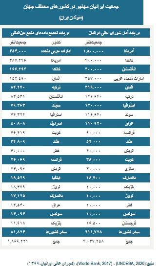 سالنامه مهاجرتی ایران در سال ۱۴۰۰ نشان میدهد که جمعیت مهاجران ایرانی در دنیا بر اساس آخرین آمار موجود قابل استناد در سال ۲۰۲۰ میلادی، ۱.۸ میلیون نفر است. البته دبیرخانه شورای عالی ایرانیان، جمعیت مهاجران خارج از کشور را ۴.۰۴ میلیون نفر برآورد کرده که این آمار بر پایه منابع بینالمللی موجود قابل راستیآزمایی نیست.