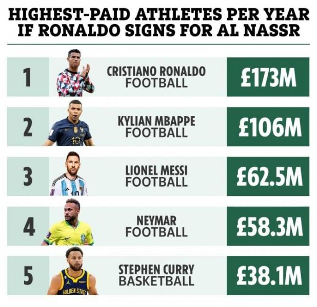 رونالدو ۳۷ ساله قبل از خروج پرحاشیه اش از یونایتد، با درآمد ۵۰ میلیون پوندی، از سه ستاره پاریسی پایین تر بود.