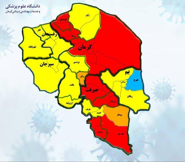 براساس این گزارش در هفته گذشته فقط شهرستان های جیرفت و منوجان در وضعیت قرمز قرار داشتند اما براساس نقشه جدید کرونایی کشور در هفته جاری (۲۵ تیرماه) شهرستان های کوهبنان، زرند، عنبرآباد، کرمان و قلعه گنج نیز به آنها پیوسته و قرمز شده اند ضمن آنکه شهرستان رابر وضعیت نارنجی هفته قبل خود را همچنان حفظ کرده است و شهرستان رودبار جنوب که در هفته قبل در وضعیت زرد کرونایی قرار داشت نیز به نارنجی تغییر رنگ داده است.