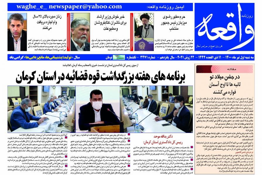 اعطای وام اجاره به زنان مجرد بالای ۳۵ سال، خبر خوش وزیر ارشاد برای ناشران، کتابفروشان و مطبوعات و میزبانی حرم رضوی از رئیس جمهور منتخب از دیگر خبرهای امروز روزنامه واقعه است.