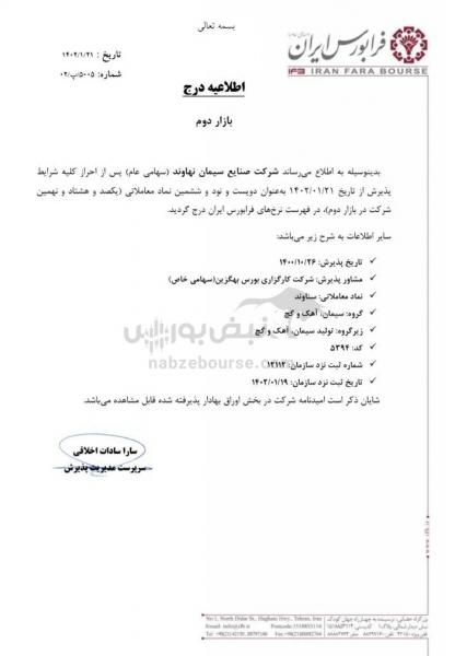 شرکت سیمان نهاوند با سرمایه اسمی ۱۲۰ میلیارد تومانی در پی احراز کلیه شرایط پذیرش با نماد “سناوند” در گروه سیمان، آهک و گچ از ۲۱ فروردین ماه به عنوان صد و هشتاد و نهمین شرکت در بازار دوم معاملات فرابورس درج شد و در صف عرضه اولیه ۱۵ درصدی سهام قرار گرفت.