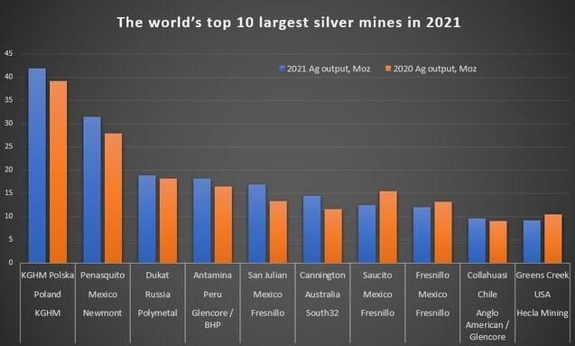معدن فرنیلو در مکزیک با ۱۲ میلیون اونس نقره در جایگاه هشتم قرار گرفت اما تولید نقره در سال ۲۰۲۱ نسبت به گذشته ۸.۲ درصد کاهش یافت.