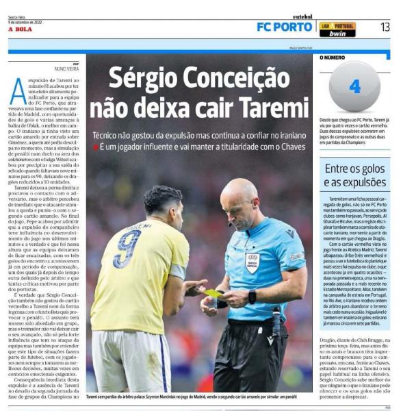 آبولا با تیتر "سرجیو کونسیسائو اجازه نمیدهد طارمی سقوط کند"، نوشته است: تکنسین اخراج را دوست نداشت، اما همچنان به ایرانی اعتماد دارد. او بازیکنی تاثیرگذار است و جایگاه خود را در دیدار با چاوز حفظ خواهد کرد.