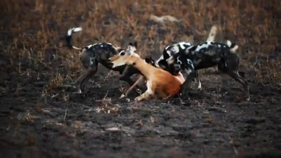 یک گله سگ وحشی در آفریقای جنوبی، شکم یک آهو را قبل از مرگ دریدند.