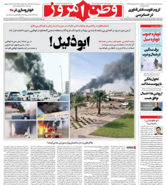 روزنامههای محافظهکار و نزدیک به سپاه در ایران (تصویرهای بالا) نیز خبر حمله به ابوظبی را با تیترهایی تحریککننده پوشش دادند. وطن امروز تیتر زدن «ابوذلیل!» و کیهان هم نوشت که حوثیها امارات را ادب کرده اند.
