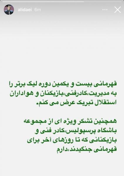 همچنین تشکر ویژه ای از مجموعه باشگاه پرسپولیس، کادرفنی و بازیکنانی که تا روز های آخر برای قهرمانی جنگیدند، دارم