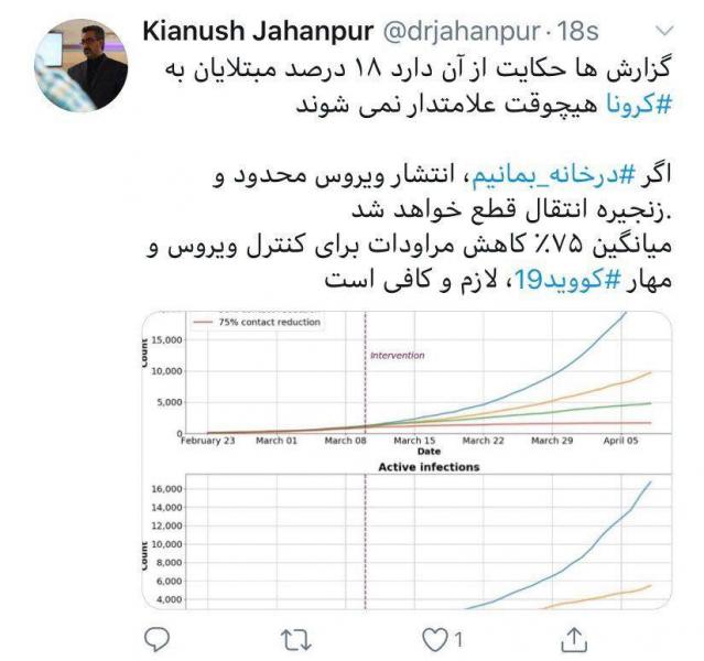 کیانوش جهانپور رئیس مرکز اطلاع رسانی وزارت بهداشت در صفحه توییتر خود نوشت: ۱۸ درصد مبتلایان هیچوقت علامتدار نمیشوند؛ اگر درخانه بمانیم انتشار ویروس محدود و زنجیره انتقال قطع خواهد شد.