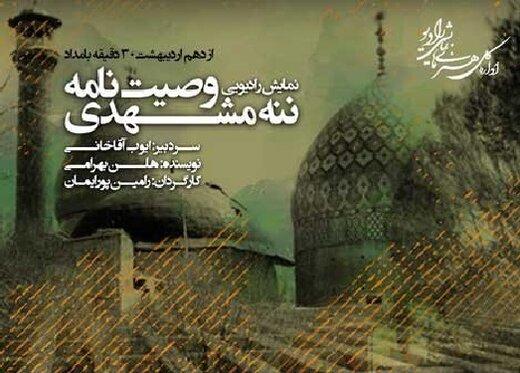 «وصیتنامه ننه مشهدی» با سردبیری ایوب آقاخانی، نویسندگی هلن بهرامی، تهیهکنندگی مهدیه تقیزاده، افکتوری نازنین حسنپور، صدابرداری حیدر صفدری و هنرمندی ناهید مسلمی، محسن بهرامی، بیوک میرزایی، مجید حمزه، شمسی صادقی، امیر زندهدلان، شهین نجفزاده، بهناز بستاندوست، مینو جبارزاده، حمید یزدانی، مونا صفی، نگین خواجهنصیر، سینا نیکوکار، احمد لشینی، ماندانا محسنی و کامیار محبی از روز شنبه ساعت ۳۰ دقیقه بامداد از رادیو نمایش پخش و ساعت ۸:۳۰ همان روز تکرار خواهد شد.