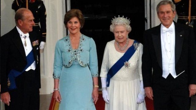 شاهزاده فیلیپ و ملکه در سال ۲۰۰۷ با جورج بوش و همسرش لورا