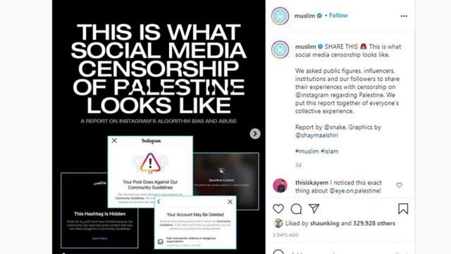 کاربران حامی فلسطینیان در فیسبوک و اینستاگرام هفته گذشته ادعا کردند هشتگهای شامل کلمه الاقصی -که به مسجدی در بیتالمقدس شرقی اشاره دارد- از دسترس خارج شده بودند. برخی دیگر از حذف تمامی پستهای اینستاگرامی مربوط به رویدادهای بیتالمقدس و محله شیخ جراح که به دنبال صدور دستور تخلیه برای چهار خانواده فلسطینی به مرکز اعتراضها تبدیل شد، خبر دادند.