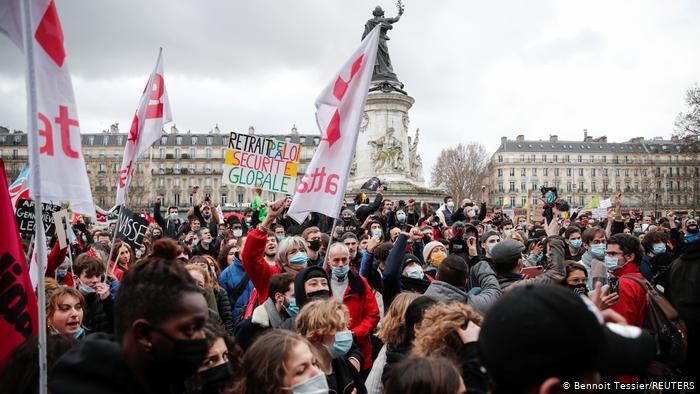 "به گفته دادستانی عمومی فرانسه ۲۶ نفر نفر عصر روز شنبه در حاشیه تظاهرات در پاریس دستگیر شدند.در چند هفته گذشته بیش از صد هزار نفر در سراسر فرانسه علیه این قانون تظاهرات کردهاند"ماموران پلیس نمیدانستند که یک دوربین مداربسته از آنها فیلم میگیرد. خشونت پلیس فرانسه در جریان اعتراضات جلیقه زردها علیه مهاجران نیز بارها در مرکز توجه اذهان عمومی قرار گرفته است.