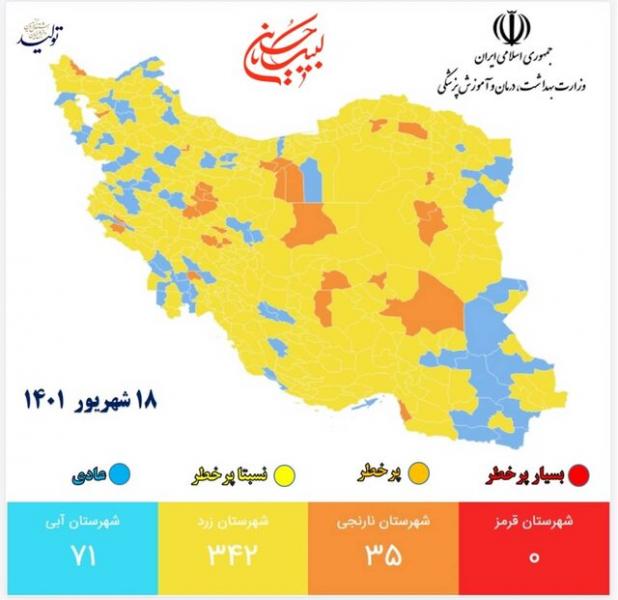 همچنین ۳۴۲ شهر در وضعیت زرد و ۷۱ شهر نیز در وضعیت آبی قرار گرفتهاند.
