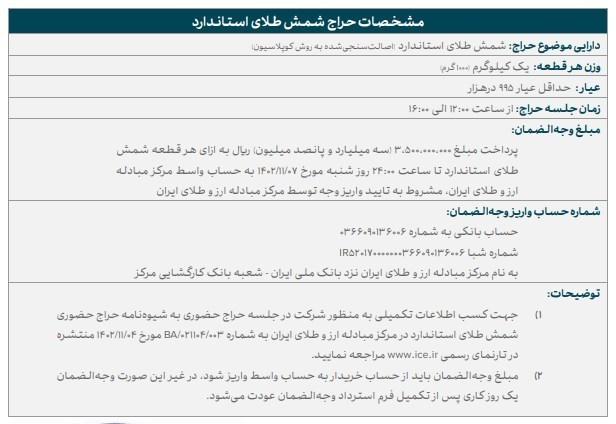 بر اساس خریداران شمش طلا از مرکز مبادله ارز و طلای ایران میتوانند برای کسب اطلاعات بیشتر و شرکت در حراج حضوری شمش طلا به نشانی اینترنتی مرکز مبادله مراجعه کنند.