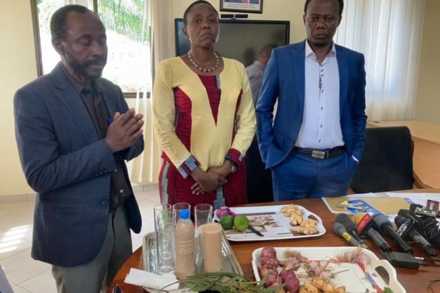 وزیر بهداشت دوروتی گواجیما (وسط) یک کنفرانس خبری برگزار کرد تا بدون ارائه شواهد نشان دهد یک معجون گیاهی، به گفته او، از افراد در برابر کووید محافظت میکند