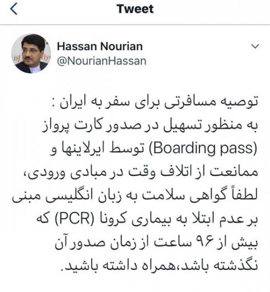 حسن نوریان، رئیس اداره گذرنامه و روادید وزارت خارجه در صفحه توییتر خود در این ارتباط خطاب به همه مسافران ورودی به کشور نوشت: به منظور تسهیل در صدور کارت پرواز ( Boarding Pass) توسط ایرلاین ها و ممانعت از اتلاف وقت در مبادی ورود، لطفا گواهی سلامت به زبان انگلیسی مبنی بر عدم ابتلا به بیماری کرونا«PCR» که بیش از ۹۶ ساعت از زمان صدور آن نگذشته باشد، همراه داشته باشید.