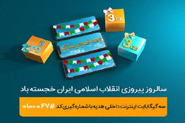 به گزارش بازرگانی خبرگزاری مهر به نقل از ادارهکل ارتباطات شرکت ارتباطات سیار ایران، مشترکان اپراتور اول تلفنهمراه میتوانند بهمناسبت دهه فجر، بسته هدیه اینترنت ٣ گیگابایتی ویژه محتوای داخلی را بهصورت رایگان از یکشنبه ١٢ بهمن تا ساعت ٢۴ روز چهارشنبه ٢٢ بهمنماه فعال کنند.