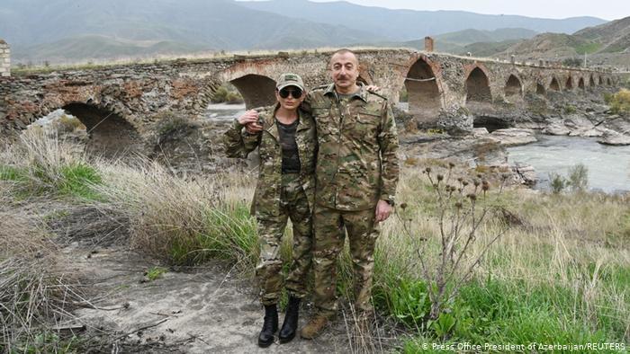 رئیس جمهور آذربایجان به همراه مهربان علیوا همسرش در حالی که یونیفرم نظامی به تن داشتند از شهرهای آزاد شده بازدید کرد.