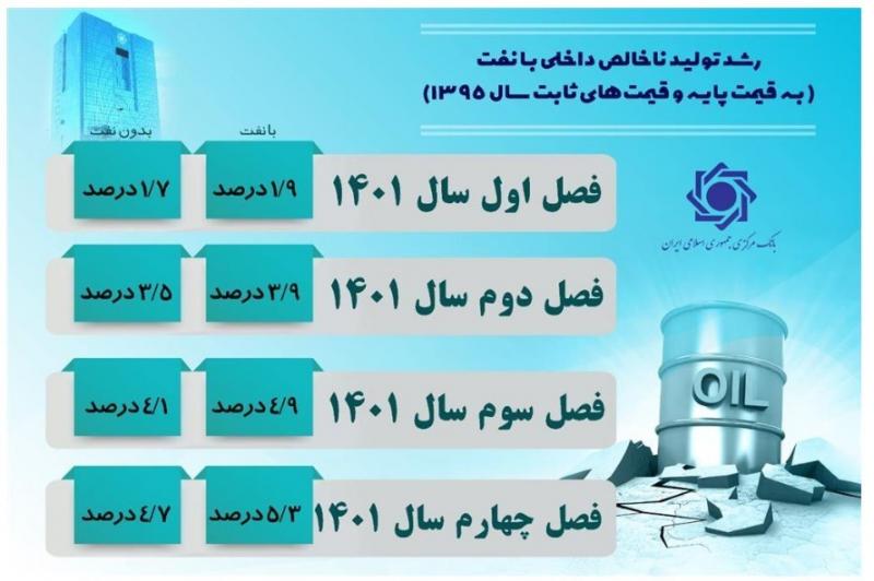 "گفتنی است رشد تولید ناخالص داخلی با نفت به قیمت پایه و به قیمتهای ثابت سال ۱۳۹۵ طی فصول اول تا چهارم سال ۱۴۰۱ به ترتیب معادل ۱.۹ ۳.۹، ۴.۹ و ۵.۳ درصد میباشد"با عنایت به اینکه میزان رشد این بخش در سال ۱۴۰۰ نسبت به سال قبل از آن برابر با ۱۰.۱ درصد بوده است، این رقم حاکی از یک روند رشد دو رقمی با ثبات در بخش نفت در طی دو سال اخیر می باشد. نتایج حاصل از محاسبات مقدماتی در این زمینه نشان دهنده آن است که افزایش نرخ رشد ارزش افزوده این گروه در سال ۱۴۰۱، ناشی از افزایش تولید و صادرات نفت خام و گاز طبیعی و همچنین صادرات میعانات گازی نسبت به سال قبل است.