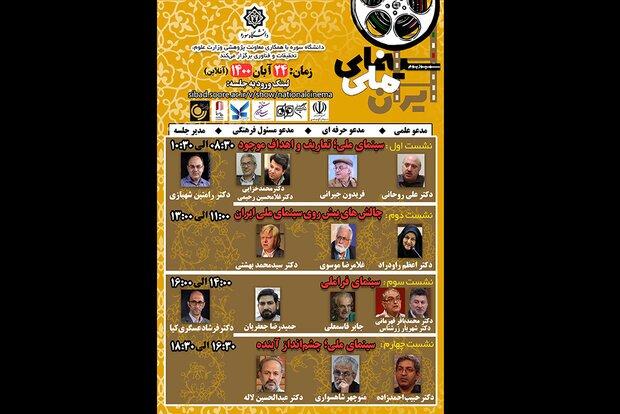 سخنرانان اولین نشست «سینمای ملی تعاریف و اهداف موجود» نام دارد میزبان محمد خزاعی رئیس سازمان سینمایی وزارت فرهنگ و ارشاد اسلامی، غلامحسین رحیمی معاون پژوهش وزارت علوم، تحقیقات و فناوری، فریدون جیرانی فیلمساز) و سیدعلی روحانی استاد دانشگاه هنر خواهد بود.