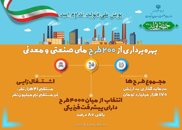 به گزارش خبرگزاری مهر به نقل از وزارت صنعت، معدن و تجارت، در هفته دهم پویش ملی «تولید، تداوم امید» و همزمان با هفته دولت ۳ طرح بزرگ صنعتی و معدنی با دستور ویدئو کنفرانسی حسن روحانی، رئیس جمهور به بهرهبرداری میرسد.