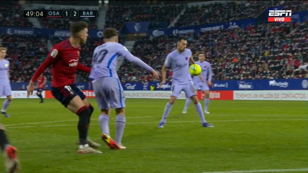 نیمه اول بازی با تساوی ۱-۱ به پایان رسید اما در نیمه دوم این بارسلونا بود که موفق شد گل برتری را به ثمر برساند؛ گلی که در وضعیت کاملا جنجالی به ثمر رسید. ماجرا از جایی شروع شد که ضربه بازیکن اوساسونا در محوطه جریمه بارسا به دست سرخیو بوسکتس برخورد کرد اما داور هیچ اعتقادی به خطا و اعلام پنالتی نداشت.