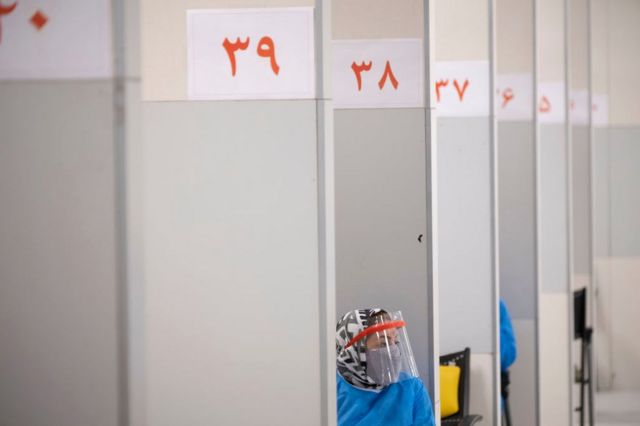 یکی از مراکز واکسیناسیون در مرکز خرید 'بازار بزرگ ایران' یا 'ایران مال' در تهران