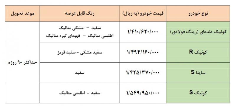 گروه خودروسازی سایپا اعلام کرد با هدف افزایش عرضه خودرو به متقاضیان و در جهت حفظ آرامش بازار، از ساعت ۱۴ روز سه شنبه نهم شهریور و به مدت سه روز فروش فوری ۴ محصول خود که شامل کوییک دندهای (رینگ فولادی)، کوییک آر، ساینا اس و کوییک اس، است را آغاز میکند.