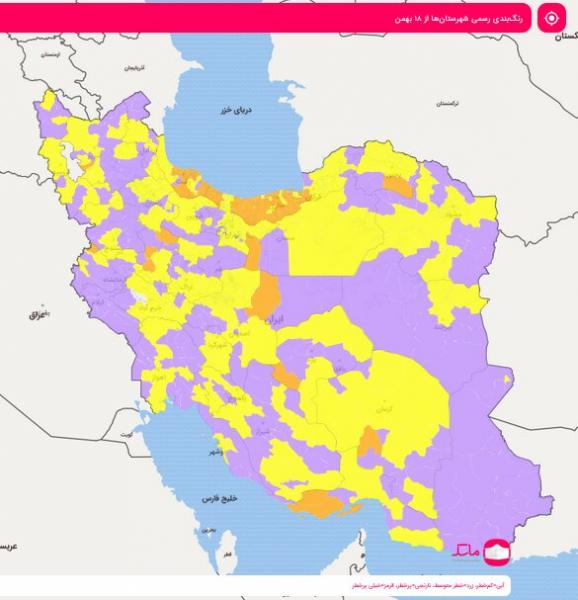 روز شنبه ۱۸ بهمنماه نیز سخنگوی ستاد ملی کرونا از خیز این ویروس در بیشتر شهرهای کشور خبر داد و اعلام کرد که ۳۶ شهر در استانهای آذربایجان شرقی، اصفهان، خراسان شمالی، سمنان، کرمانشاه، گیلان، مازندران، گلستان، هرمزگان، همدان و یزد نارنجی شده و در وضعیت پرخطر قرار گرفتهاند.