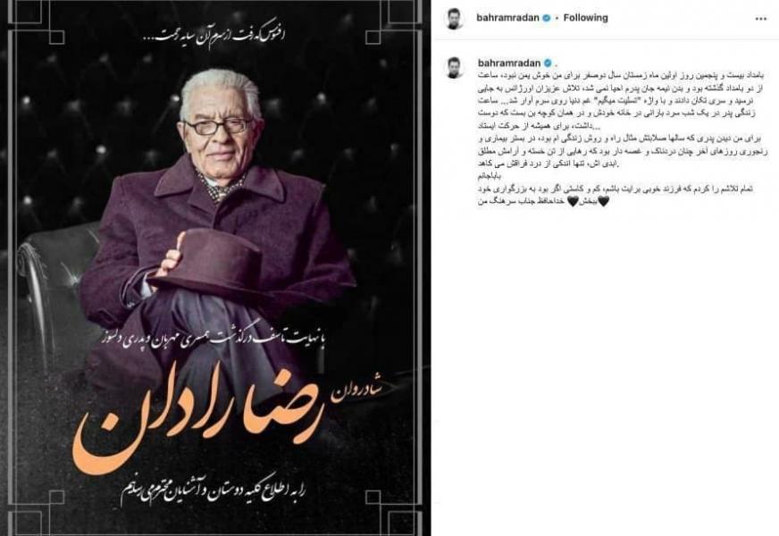 بهرام رادان، پس از درگذشت پدرش در صفحه اینستاگرامش چنین نوشت: