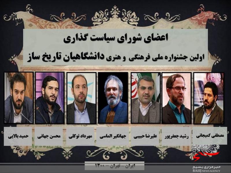 به گزارش گروه دانشگاه خبرگزاری دانشجو، حمید بالایی، جانشین سازمان بسیج دانشجویی کشور و رئیس شورای سیاست¬گذاری جشنواره در احکامی جداگانه، *محسن جهانی، دکتر جهانگیر الماسی، مصطفی کمیجانی، دکتر مهرداد توکلی، دکتر رشید جعفرپور و دکتر علیرضا حبیبی* را به عنوان اعضای شورای سیاستگذاری این جشنواره منصوب کرد.