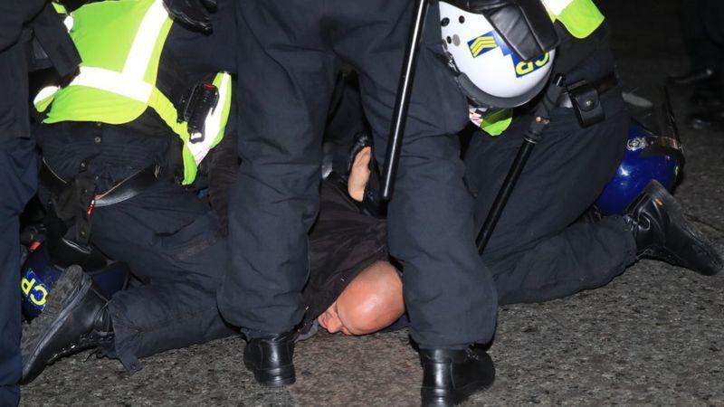 این بیانیه میافزاید: «ما معترضان را هدایت کردیم که به خانههای خود بازگردند». با این حال تصاویر منتشر شده در فضای مجازی و رسانهها از رفتار خشن پلیس لندن با افراد معترض حکایت دارد.