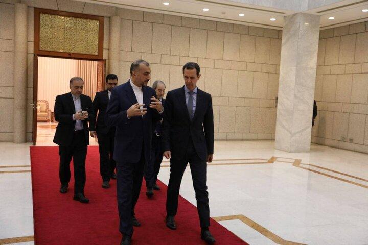 در این دیدار رئیس جمهور سوریه از پیامها و مواضع همبستگی و همدردی مقام معظم رهبری و حجت الاسلام رئیسی رئیس جمهور و کمکها و حمایتهای دولت و ملت جمهوری اسلامی ایران از زلزله زدگان سوریه تقدیر و تشکر به عمل آورد. وی افزود سفر امروز شما به مناطق زلزله زده نشان داد که حمایتهای دولت و ملت ایران از سوریه و زلزله زدگان سوری تنها یک حمایت مادی نیست بلکه جنبههای قوی معنوی دارد و ارزشمند است. آقای بشار اسد تاکید کرد در شرایط حساس تحولات منطقهای این سفر یک معنای عمیق سیاسی نیز به همراه دارد.