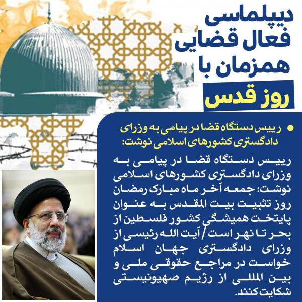 دستگاه قضایی جمهوری اسلامی ایران ضمن حمایت از حق بدیهی و مشروع مقاومت ملت فلسطین، ابتکار رهبر انقلاب اسلامی امام خامنهای را که سال گذشته به عنوان سند شورای امنیت سازمان ملل منتشر شد، راه حل صلح آمیز و پایدار برای احقاق حق فلسطینیها و پایان دادن به اشغال و تجاوز دانسته و بر ضرورت به کارگیری همه ظرفیتهای ملی، منطقهای و بین المللی دستگاه قضایی کشورهای اسلامی در حمایت از مظلوم و مقابله با ظلم تاکید مینماید. از این رو قوه قضاییه جمهوری اسلامی ایران آمادگی خود را برای پیگیری استیفای حقوق ملت فلسطین و رسیدگی به جنایتها و تجاوزهای رژیم صهیونیستی در مراجع حقوقی ملی و بین المللی با همفکری و همکاری جناب عالی و دستگاه قضایی کشور شما ابراز میدارد تا مسئولیت انسانی و وظیفه دینی خود در قبال ملت مظلوم فلسطین را جامه عمل بپوشانیم. سید ابراهیم رییسی انتهای پیام/