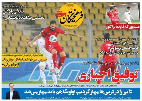 به گزارش گروه ورزشی خبرگزاری دانشجو، تیتر نیم صفحه نخست روزنامههای ورزشی دوشنبه ۷ اردیبهشت ۱۴۰۰ به مسائل مهم روز ورزش از جمله فوتبال پرداخته است.