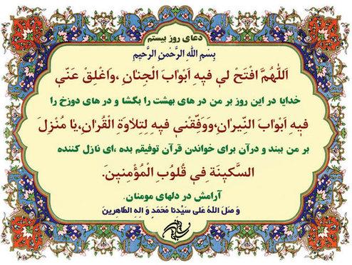 «خداوندا، در این روز درهای بهشتها را به روی من بگشا و درهای آتش دوزخ را ببند، مرا توفیق تلاوت قرآن عطا فرما،ای نازلکننده آرامش در دلهای مؤمنان.»