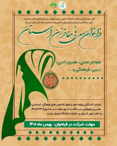 به گزارش ایسنا، دفتر امور بانوان و خانواده دانشگاه شهید چمران اهواز در راستای برگزاری اولین همایش ملی جایگاه زن در سبک زندگی ایرانی اسلامی و به مناسبت نکوداشت دهه مبارک فجر فراخوان معرفی زنان مفاخر استان را منتشر کرد.