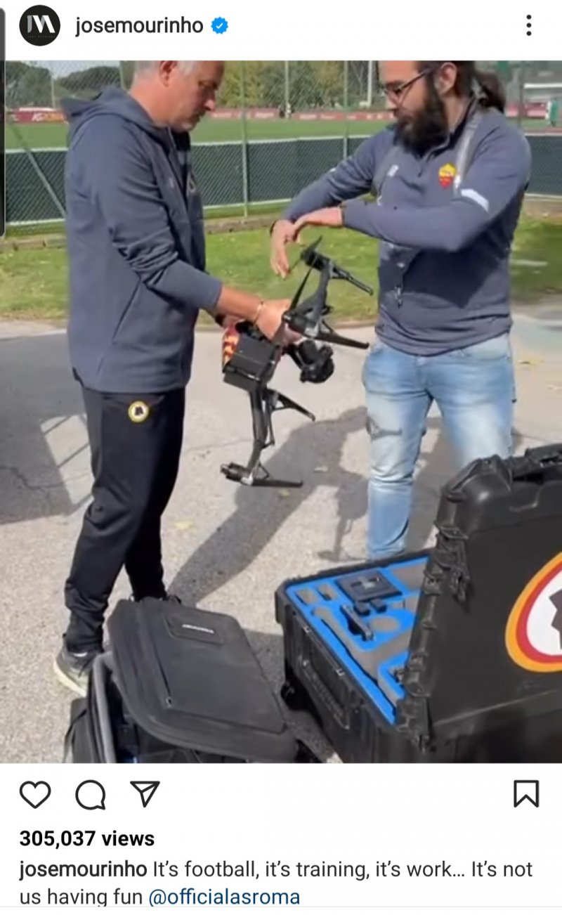 در همین راستا ژوزه مورینیو یک پست جالب را در صفحه اینستاگرام خود به اشتراک گذاشته است؛ جایی که نشان میدهد او برای تجزیه و تحلیل کارهای تاکتیکی تیم خود از یک پهپاد کمک گرفته است. مورینیو ضمن به اشتراک گذاشتن یک ویدئو در این رابطه، نوشت: " این فوتبال است، تمرین است، کار است ... فرصتی برای لذت بردن وجود ندارد."
