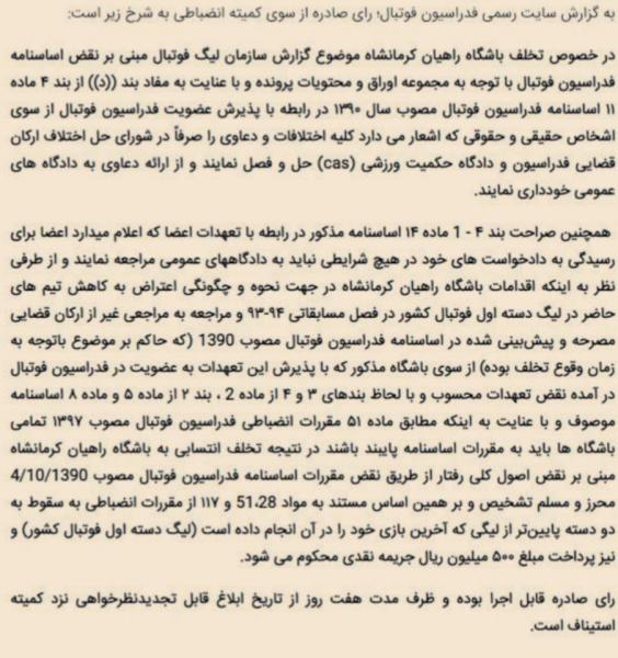 در خصوص تخلف باشگاه راهیان کرمانشاه موضوع گزارش سازمان لیگ فوتبال مبنی بر نقض اساسنامه فدراسیون فوتبال با توجه به مجموعه اوراق و محتویات پرونده و با عنایت به مفاد بخش «د» از بند ۴ ماده ۱۱ اساسنامه فدراسیون فوتبال مصوب سال ۱۳۹۰ در رابطه با پذیرش عضویت فدراسیون فوتبال از سوی اشخاص حقیقی و حقوقی که اشعار میدارد کلیه اختلافات و دعاوی را صرفاً در شورای حل اختلاف ارکان قضایی فدراسیون و دادگاه حکمیت ورزشی (CAS) حل و فصل نمایند و از ارائه دعاوی به دادگاه های عمومی خودداری نمایند.