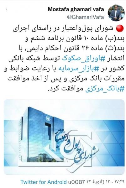 به گزارش پایگاه خبری«عصر اعتبار»، مصطفی قمری وفا، مدیر روابط عمومی بانک مرکزی در توییتی خبر داد: شورای پولواعتبار در راستای اجرای بند(ب) ماده ۱۰ قانون برنامه ششم و بند(ث) ماده ۳۶ قانون احکام دایمی، با انتشار اوراق صکوک توسط شبکه بانکی کشور در بازار سرمایه با رعایت ضوابط و مقررات بانک مرکزی و پس از اخذ موافقت بانک مرکزی موافقت کرد.